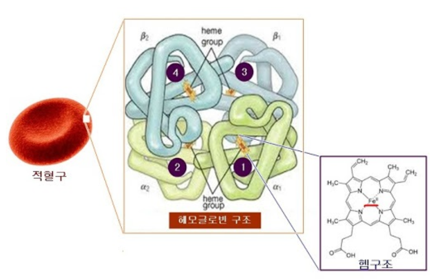 헤모글로빈은 4개의 단백질 사슬(globin)이 결합한 복합체로 이루어져 있으며,